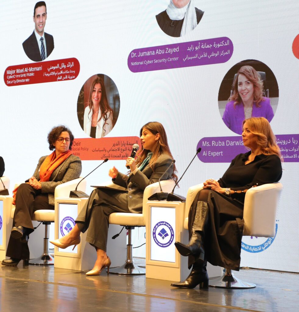 وتضمنت الفعالية جلسة حوارية حول “العنف الرقمي ضد النساء والفتيات: مسؤولية جماعية نحو فضاء رقمي آمن” بمشاركة السيدة منال بنكيران نائبة ممثل هيئة الأمم المتحدة للمرأة في الأردن والدكتورة جمانة أبو زايد من المركز الوطني للأمن السيبراني والرائد وائل المومني من مديرية الأمن العام/ وحدة الجرائم الإلكترونية والسيدة يارا الدير أخصائية النوع الاجتماعي والسياسات في صندوق الأمم المتحدة للسكان والسيدة ربا درويش خبيرة في أدوات وتطبيقات الذكاء الاصطناعي، وتبع الجلسة نقاشاً مع الحضور.